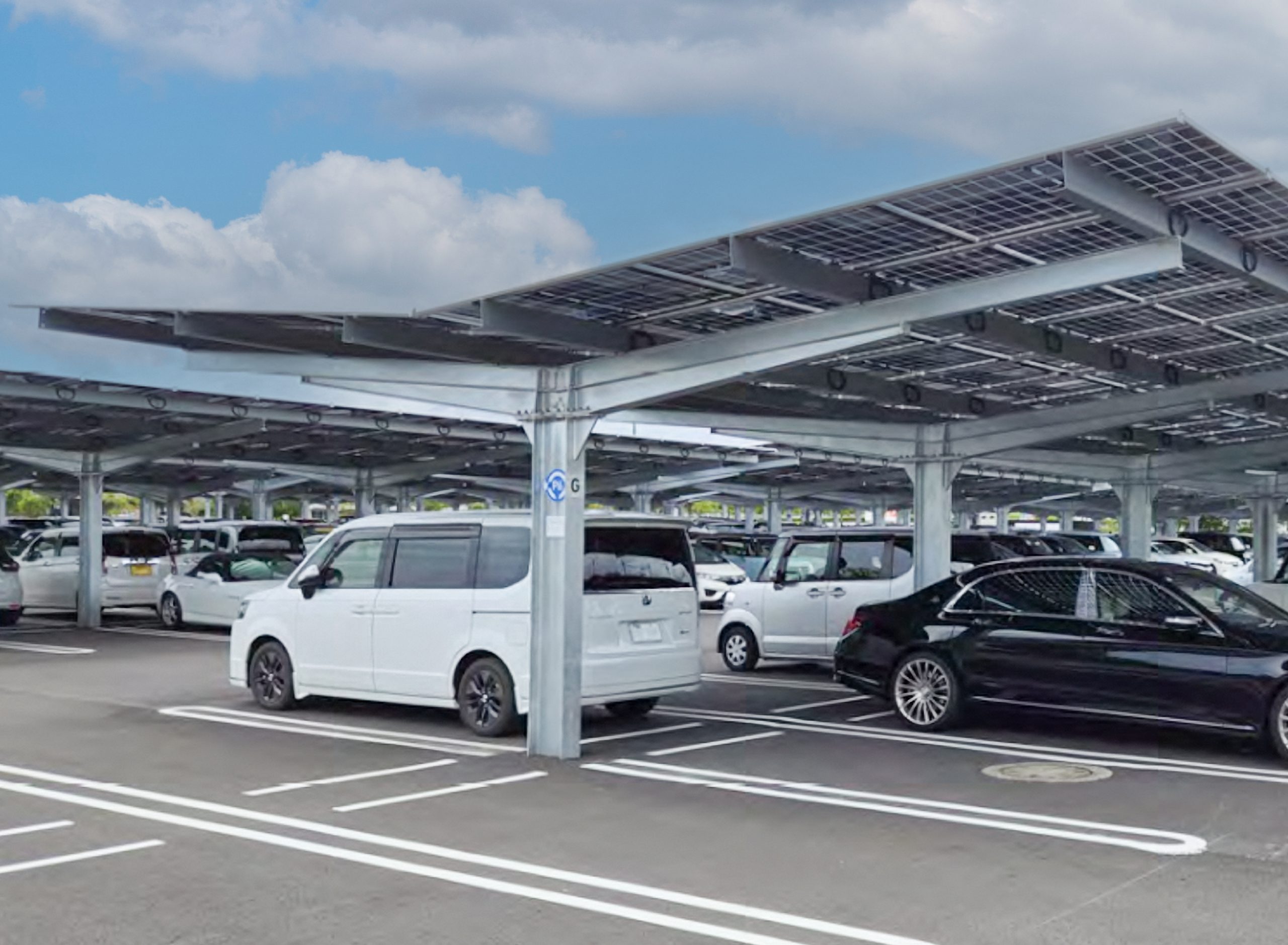 前方柱なし、斜め駐車も対応可能な鋼製1本柱タイプのソーラーカーポートです。