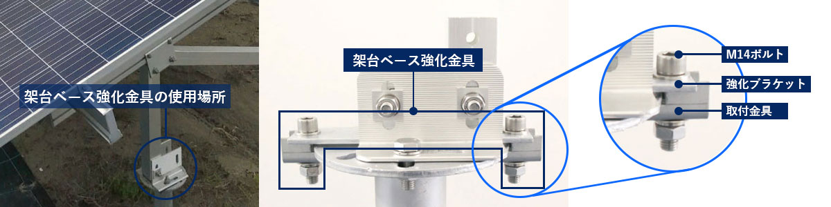風荷重や地震荷重が架台の接合部に集中した際に発生しやすい、架台ベースの変形や破損リスクを低減するため「架台ベース強化金具」を追加し、杭フランジ(接合プレート)と架台ベースの結合力を高めることで構造安定性を向上させます。
